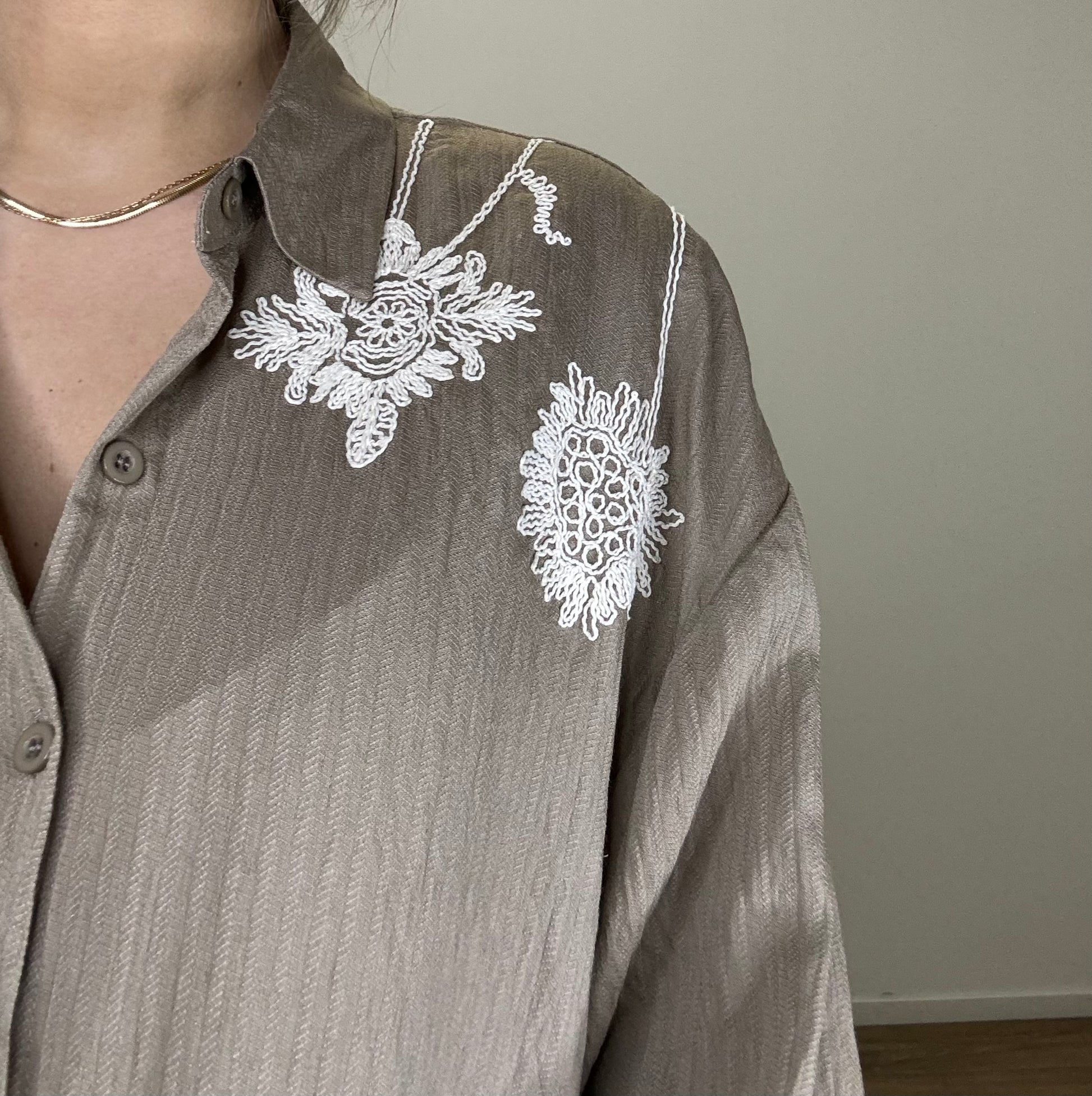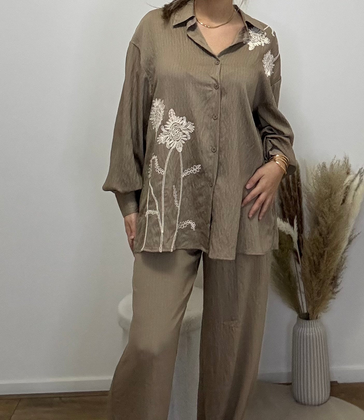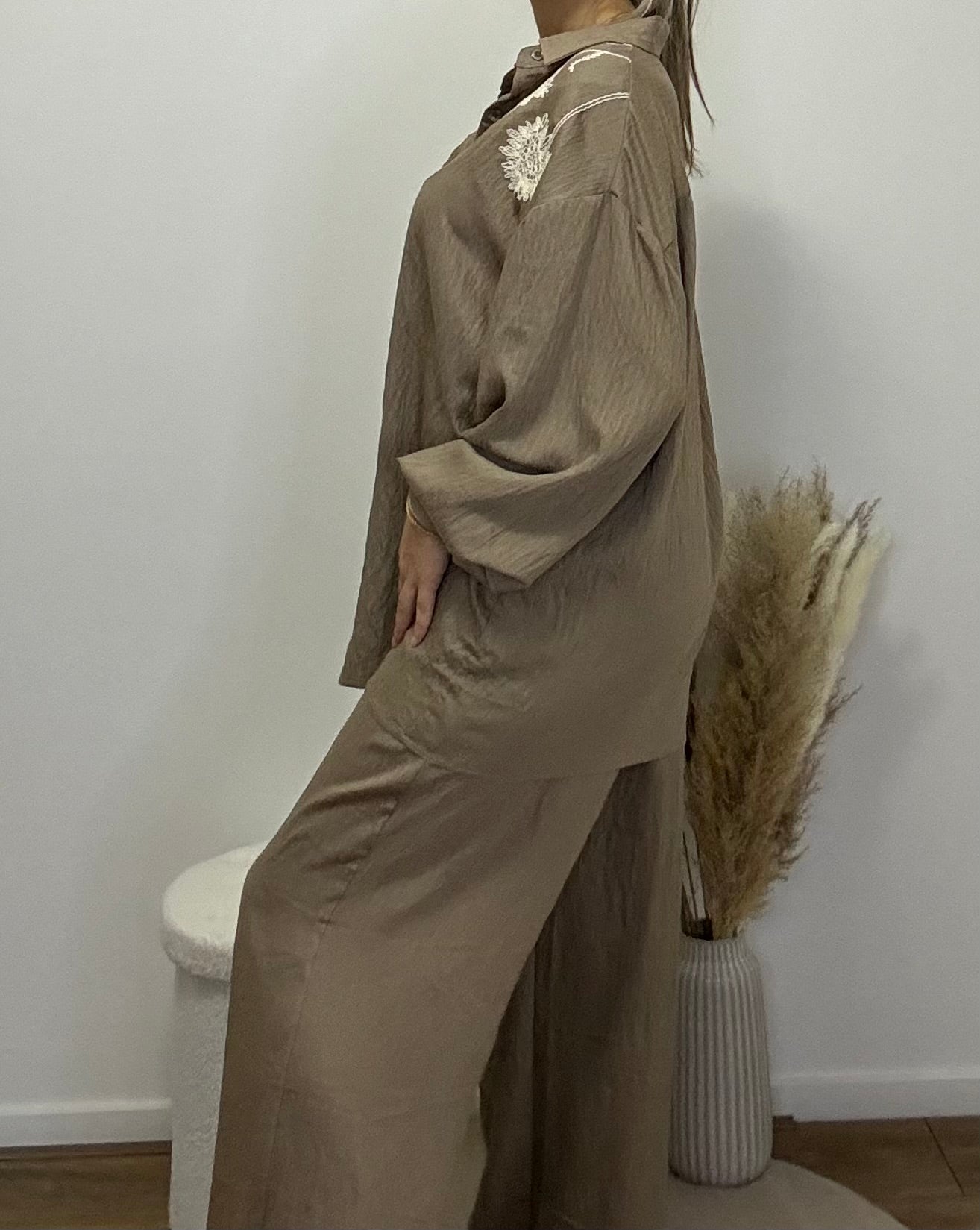 De Dalia Set is een stijlvolle combinatie van comfort en elegantie. Met de losse, rechte broek en oversized blouse is deze set ideaal voor een effortless chique look. De verfijnde bloemenapplicaties geven een speelse en vrouwelijke touch aan het geheel. Perfect voor zowel een casual dagje uit als een nette gelegenheid.